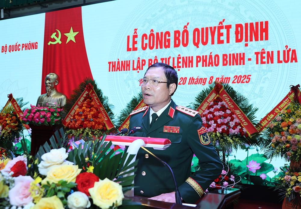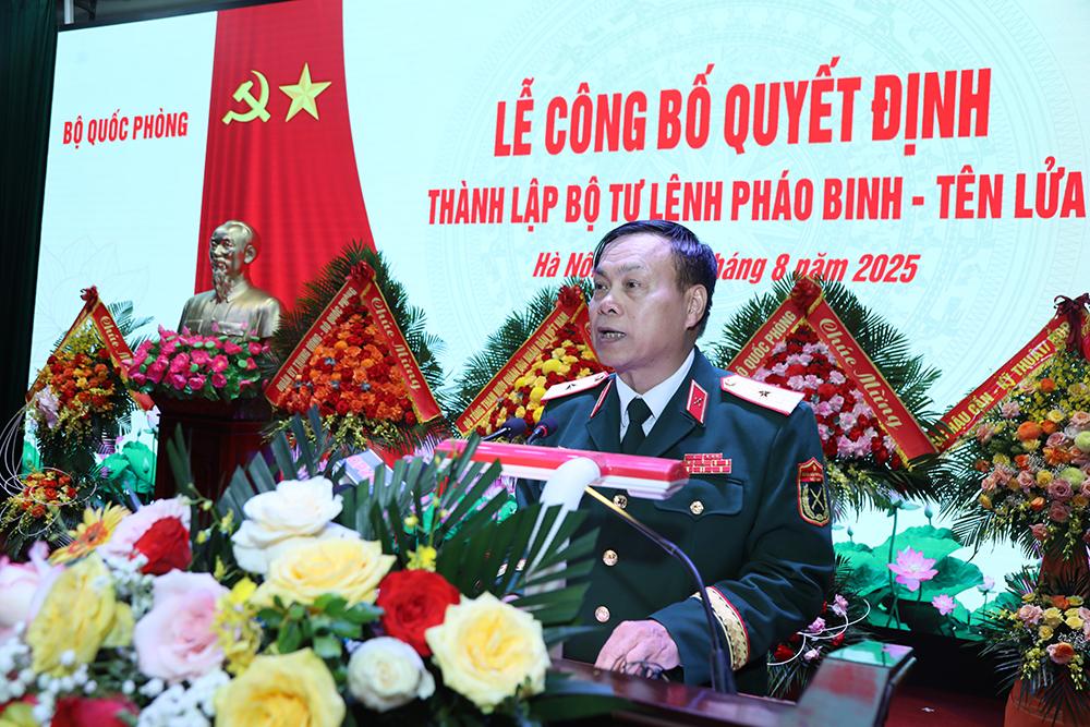 Trao Quân kỳ Quyết thắng và giao nhiệm vụ cho Bộ Tư lệnh Pháo binh - Tên lửa, Đại tướng Nguyễn Tân Cương cho biết, thực hiện Nghị quyết của Bộ Chính trị và Kết luận của Thường vụ Quân ủy Trung ương, Bộ Quốc phòng đã ban hành Quyết định thành lập Bộ Tư lệnh Pháo binh - Tên lửa trên cơ sở Binh chủng Pháo binh.