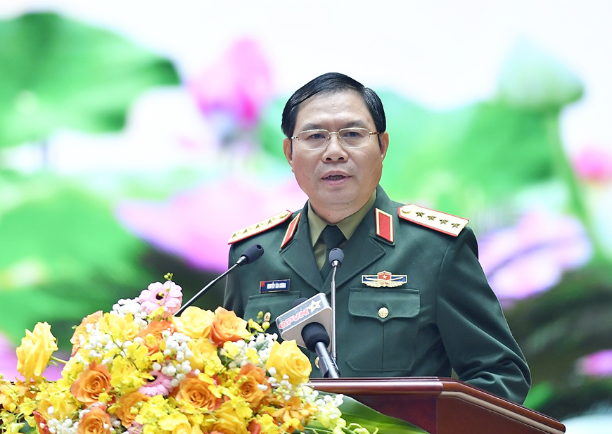 Đại tướng Nguyễn Tân Cương trình bày báo cáo tại hội nghị.