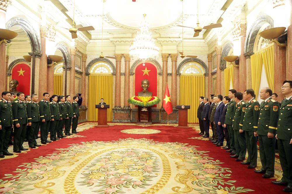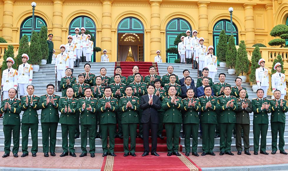 Chủ tịch nước Lương Cường chỉ rõ, thời gian tới, tình hình thế giới, khu vực dự báo sẽ tiếp tục diễn biến rất phức tạp; hòa bình, hợp tác và phát triển vẫn là xu thế chủ đạo, nhưng đang đứng trước những thách thức nghiêm trọng; cạnh tranh chiến lược giữa các nước lớn diễn ra ngày càng gay gắt. Trong nước, sau gần 40 năm đổi mới, nước ta đạt được những thành tựu to lớn, có ý nghĩa lịch sử, nhưng cũng đang phải đối mặt với nhiều khó khăn, thách thức. Trong bối cảnh đó, Chủ tịch nước yêu cầu các đồng chí vừa được thăng quân hàm tiếp tục phát huy truyền thống vẻ vang của Quân đội nhân dân Việt Nam anh hùng; giữ gìn phẩm chất đạo đức cách mạng; đoàn kết, gắn bó máu thịt với cán bộ, chiến sĩ và Nhân dân; học tập, tu dưỡng, rèn luyện để luôn xứng đáng với đạo làm Tướng như Bác Hồ kính yêu đã dạy; và là người lãnh đạo, chỉ huy tài năng, mẫu mực, đoàn kết, nỗ lực phấn đấu, khắc phục khó khăn, thử thách, hoàn thành xuất sắc mọi nhiệm vụ mà Đảng, Nhà nước và Nhân dân tin tưởng giao phó.