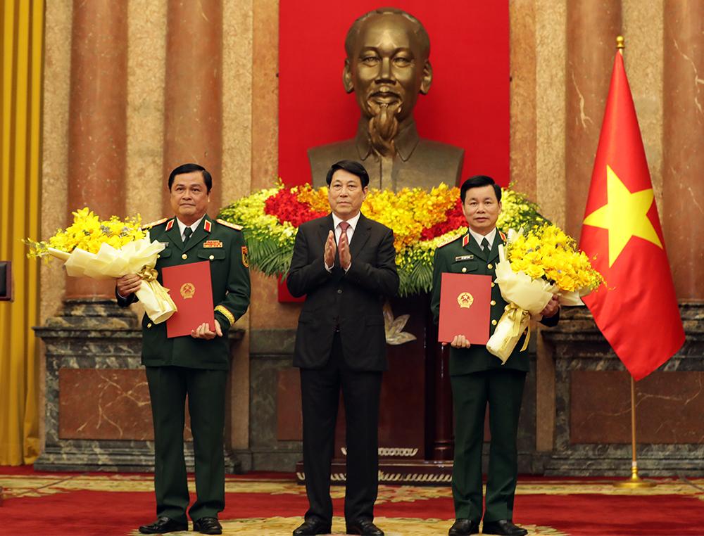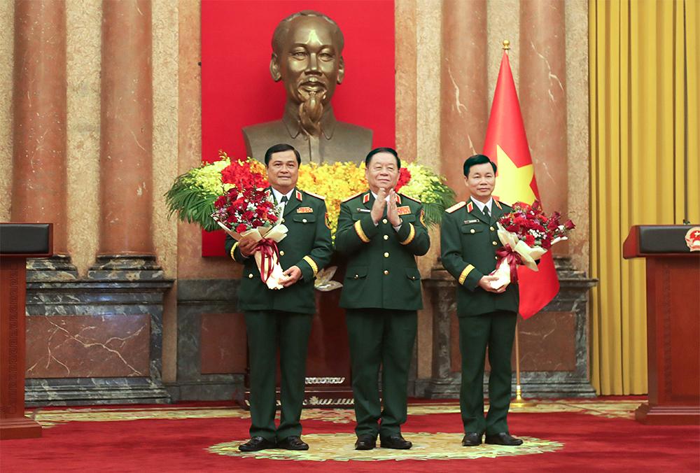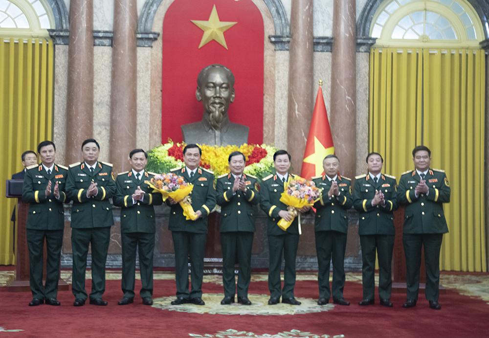 Chủ tịch nước Lương Cường trao Quyết định thăng quân hàm Thượng tướng đối với đồng chí Đỗ Xuân Tụng và đồng chí Đỗ Văn Bảnh.
