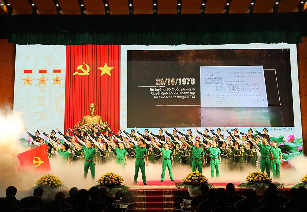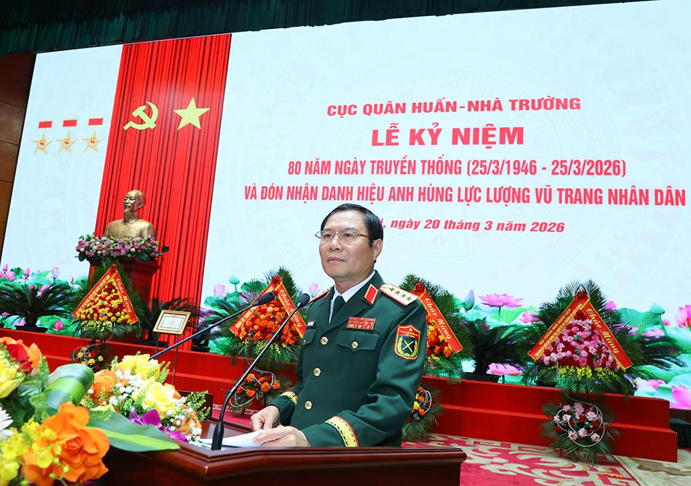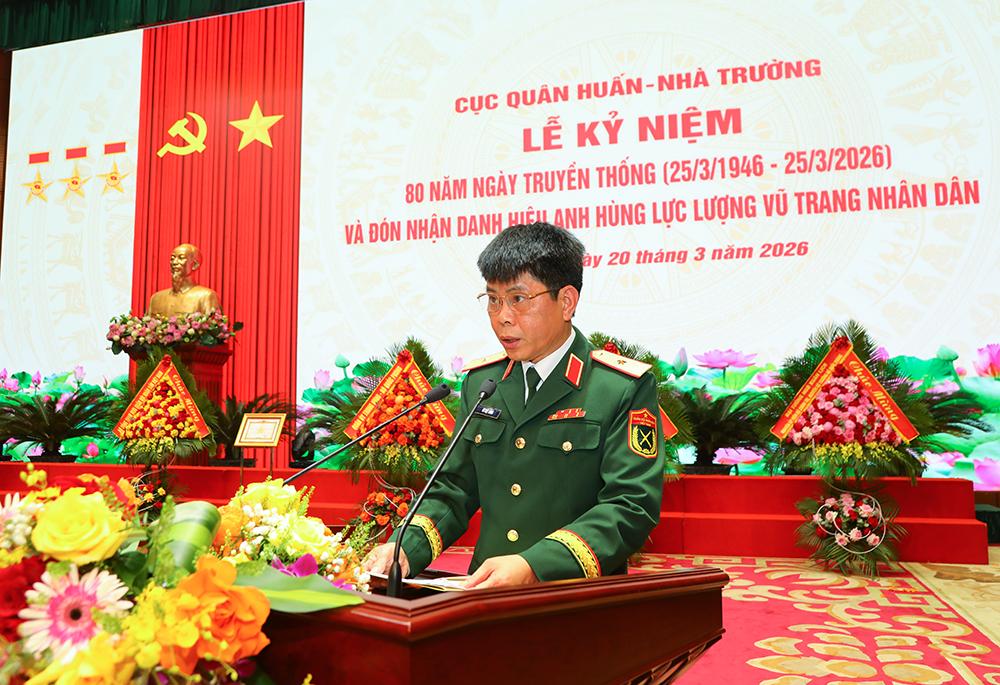Diễn văn tại buổi lễ do Thiếu tướng Vũ Việt Hùng, Cục trưởng Cục Quân huấn - Nhà trường trình bày nhấn mạnh: Cách đây 80 năm, ngày 25/3/2026, Chủ tịch Hồ Chí Minh ký Sắc lệnh số 34 “Đặt một vài căn bản cho việc tổ chức quốc phòng”, cơ quan Bộ Quốc phòng có Văn phòng và 10 cục nghiệp vụ chuyên môn, trong đó có Quân huấn cục, tiền thân của Cục Quân huấn - Nhà trường. Trải qua 80 năm xây dựng, chiến đấu và trưởng thành, dưới sự lãnh đạo, chỉ đạo của Đảng, Nhà nước, Quân ủy Trung ương, Bộ Quốc phòng, thường xuyên, trực tiếp là Đảng ủy, Thủ trưởng Bộ Tổng Tham mưu; các thế hệ cán bộ, chiến sĩ Cục Quân huấn - Nhà trường luôn tuyệt đối trung thành với Tổ quốc, với Đảng, Nhà nước và Nhân dân, vượt qua mọi khó khăn, gian khổ, hy sinh; đoàn kết, dũng cảm, chủ động, sáng tạo, hoàn thành xuất sắc mọi nhiệm vụ được giao.