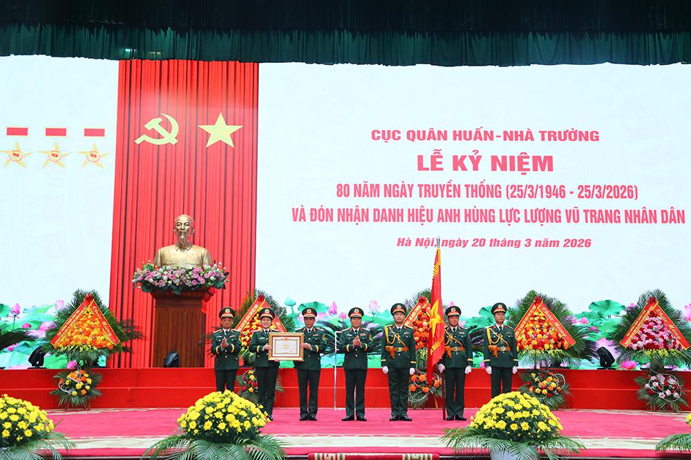 (Bqp.vn) - Sáng 20/3, tại Hà Nội, Cục Quân huấn - Nhà trường (Bộ Tổng Tham mưu QĐND Việt Nam) tổ chức Lễ kỷ niệm 80 năm Ngày truyền thống (25/3/1946 - 25/3/2026) và đón nhận danh hiệu Anh hùng Lực lượng vũ trang (LLVT) nhân dân. Thừa ủy quyền của Chủ tịch nước, Đại tướng Nguyễn Tân Cương, Ủy viên Trung ương Đảng, Ủy viên Thường vụ Quân ủy Trung ương, Tổng Tham mưu trưởng QĐND Việt Nam, Thứ trưởng Bộ Quốc phòng dự và trao danh hiệu Anh hùng LLVT nhân dân tặng Cục Quân huấn - Nhà trường.