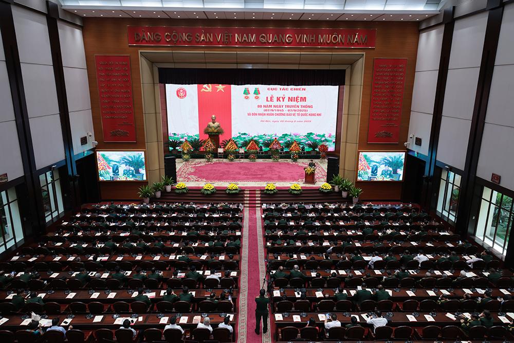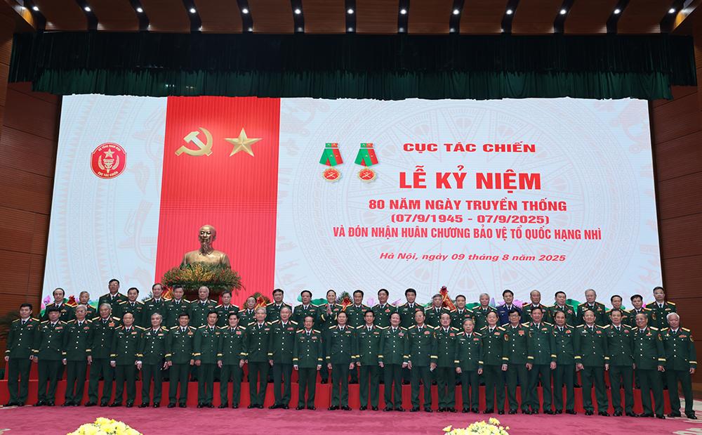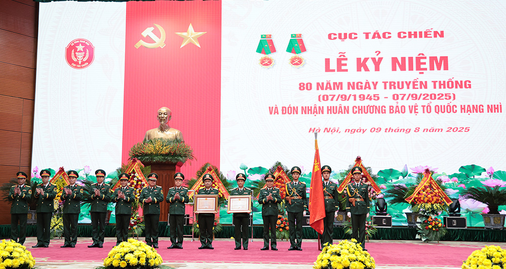 (Bqp.vn) - Sáng 9/8, tại Hà Nội, Cục Tác chiến (Bộ Tổng Tham mưu) long trọng tổ chức Lễ kỷ niệm 80 năm Ngày truyền thống (07/9/1945 - 07/9/2025) và đón nhận Huân chương Bảo vệ Tổ quốc hạng Nhì. Đại tướng Phan Văn Giang, Ủy viên Bộ Chính trị, Phó Bí thư Quân ủy Trung ương, Bộ trưởng Bộ Quốc phòng gửi thư chúc mừng; Đại tướng Ngô Xuân Lịch, nguyên Ủy viên Bộ Chính trị, nguyên Phó Bí thư Quân ủy Trung ương, nguyên Bộ trưởng Bộ Quốc phòng gửi lẵng hoa chúc mừng.