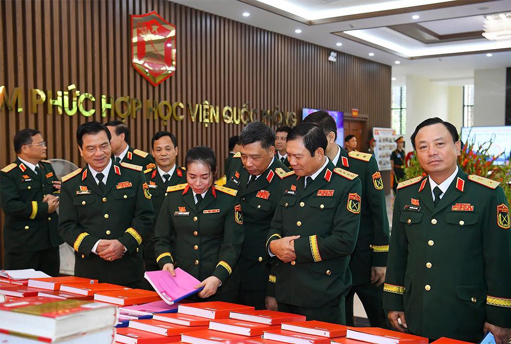 Đại tướng Nguyễn Tân Cương cùng các đại biểu thăm quan khu trưng bày các các mô hình, sáng kiến, đề tài nghiên cứu của Học viện Quốc phòng.