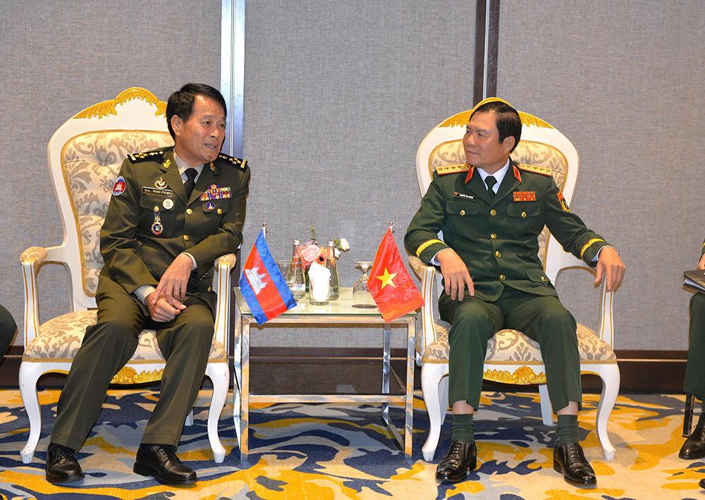 Đại tướng Nguyễn Tân Cương gặp Tổng Tư lệnh Quân đội Hoàng gia Cam-pu-chia.