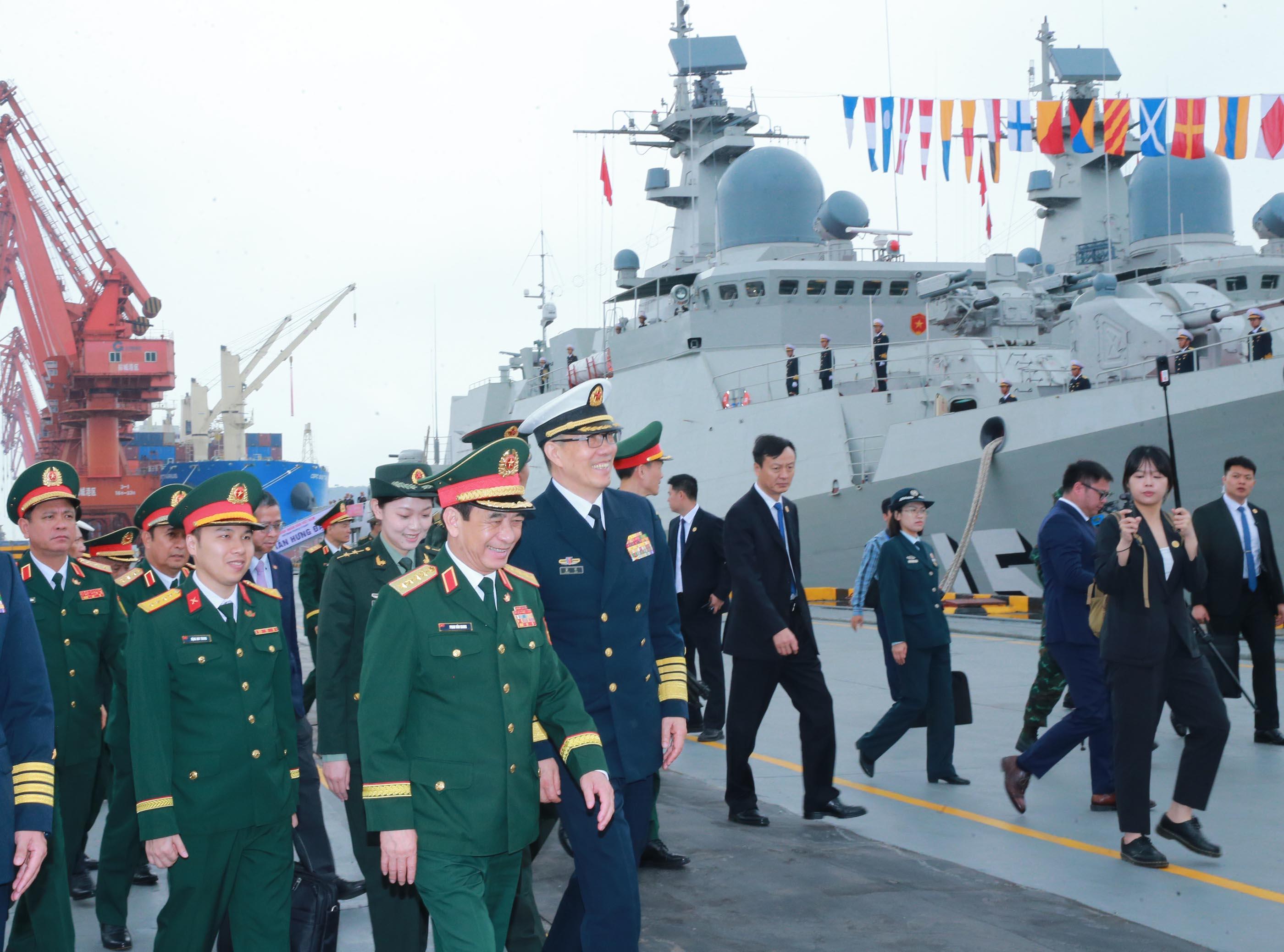 Hai Bộ trưởng đến cảng Phòng Thành tham quan tàu hải quân hai nước.