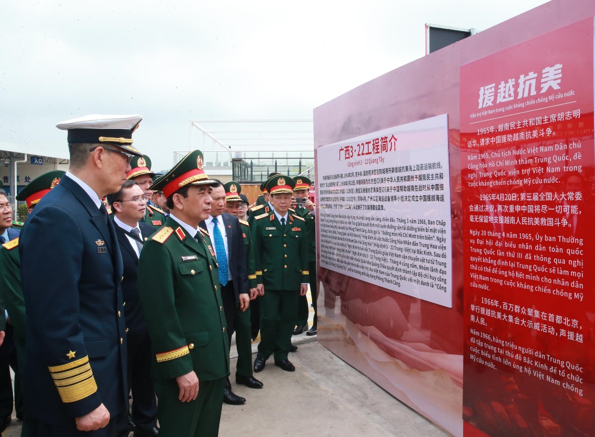 Tiếp tục chương trình, hai Bộ trưởng cùng đoàn đại biểu đến tham quanKhu Di tích “Đường Hồ Chí Minh trên biển”tại bến cảng du lịch Phòng Thành, Quảng Tây. Tại đây, hai đồng chí Bộ trưởng đã tham quan Khu Di tích và bức tường trưng bày một số nội dung liên quan đến đường Hồ Chí Minh trên biển.