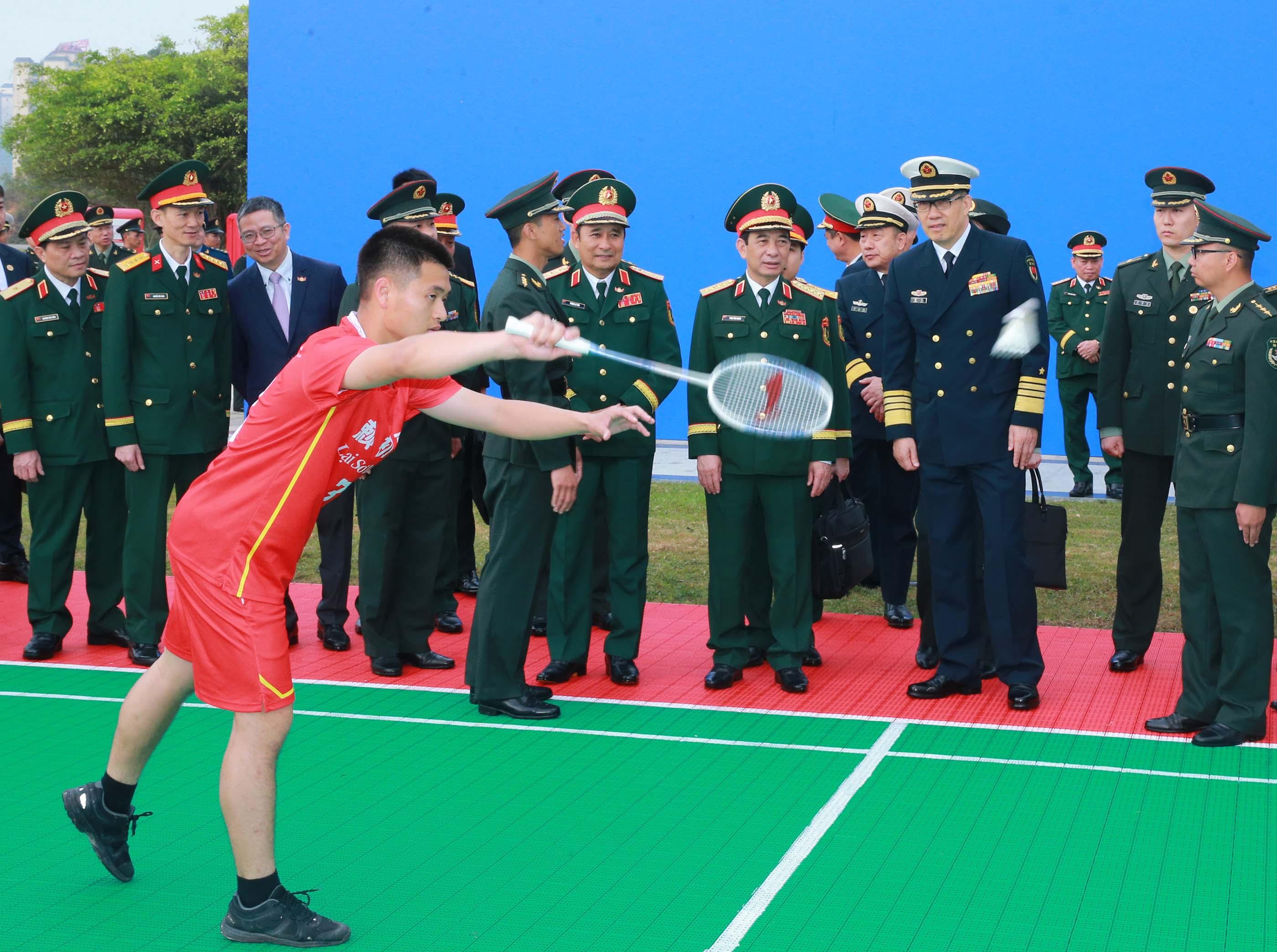 Đại tướng Phan Văn Giang và Thượng tướng Đổng Quân theo dõi Hai bênthi đấu giao hữu cầu lông.