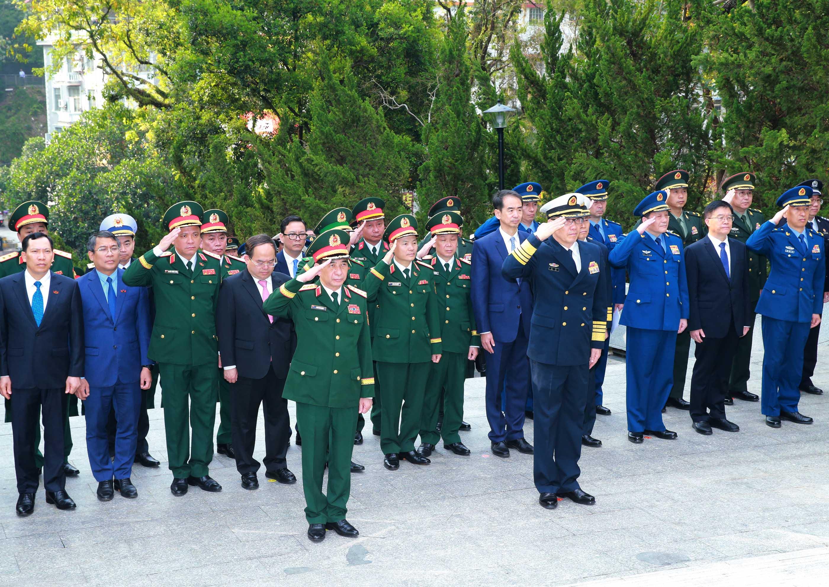 Đại tướng Phan Văn Giang và Thượng tướng Đổng Quân cùng các đại biểu tham quan Đài tưởng niệm liệt sĩ cách mạng nhân dân Việt- Trung.