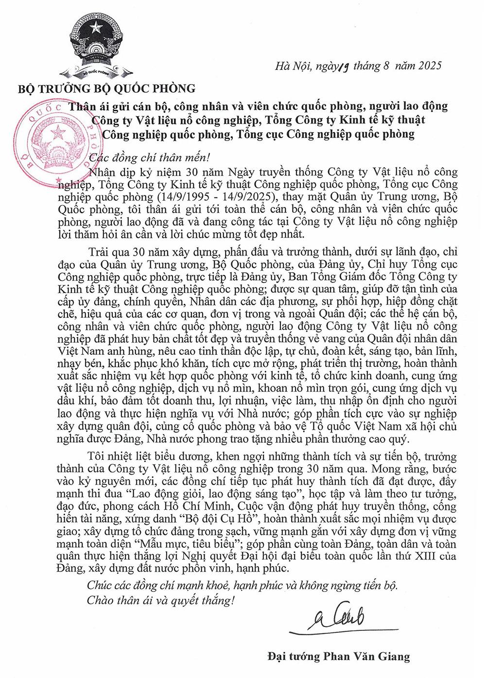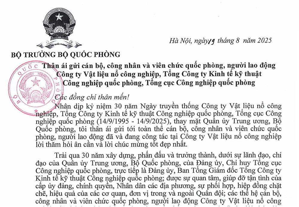 Nhân dịp kỷ niệm 30 năm Ngày truyền thống Công ty Vật liệu nổ công nghiệp, Tổng Công ty Kinh tế kỹ thuật Công nghiệp quốc phòng, Tổng cục Công nghiệp quốc phòng (14/9/1995 - 14/9/2025), thay mặt Quân ủy Trung ương, Bộ Quốc phòng, tôi thân ái gửi tới toàn thể cán bộ, công nhân và viên chức quốc phòng, người lao động đã và đang công tác tại Công ty Vật liệu nổ công nghiệp lời thăm hỏi ân cần và lời chúc mừng tốt đẹp nhất.