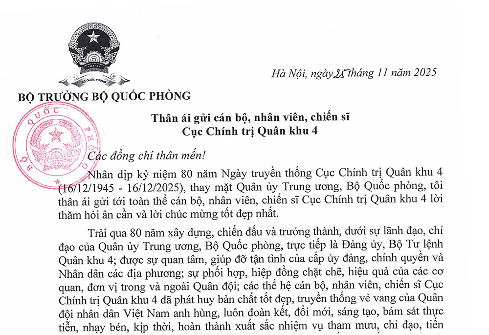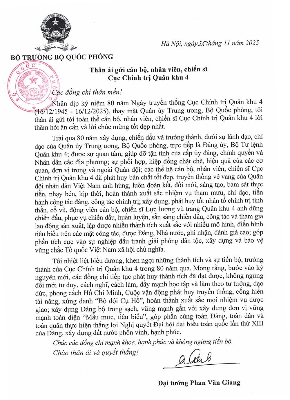 (Bqp.vn) - Nhân dịp kỷ niệm 80 năm Ngày truyền thống Cục Chính trị Quân khu 4 (16/12/1945 - 16/12/2025), Đại tướng Phan Văn Giang, Ủy viên Bộ Chính trị, Phó Bí thư Quân ủy Trung ương, Bộ trưởng Bộ Quốc phòng đã gửi thư chúc mừng tới toàn thể cán bộ, nhân viên, chiến sĩ Cục Chính trị Quân khu 4. Dưới đây là nội dung Thư của Đại tướng Phan Văn Giang: