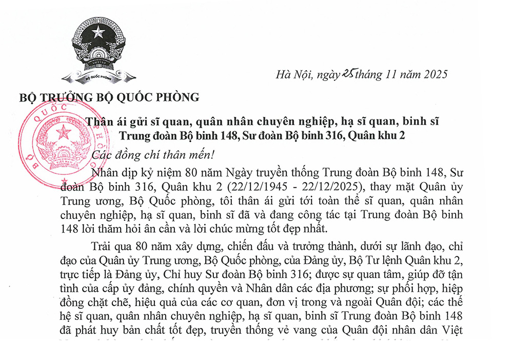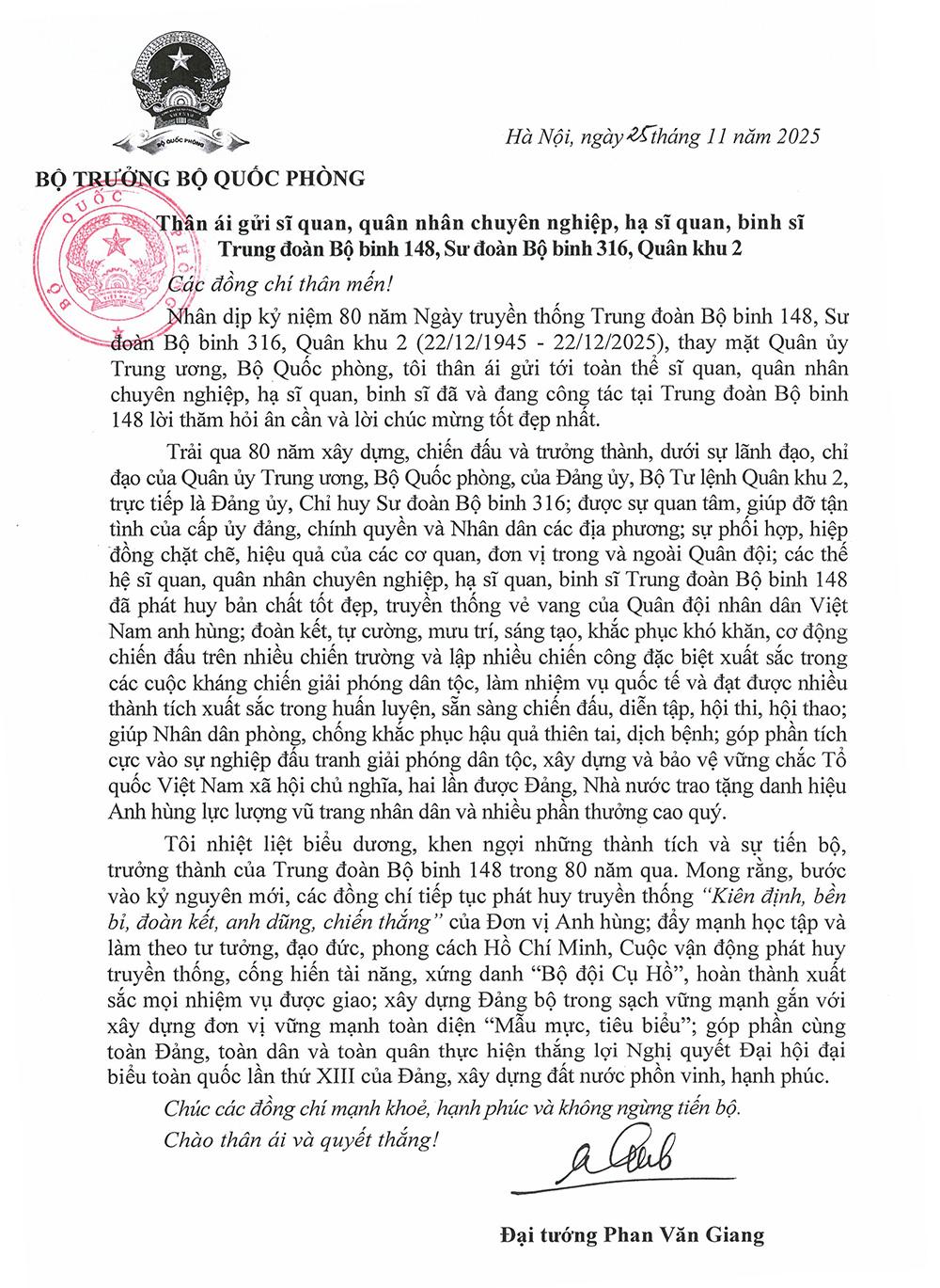 (Bqp.vn) - Nhân dịp kỷ niệm 80 năm Ngày truyền thống Trung đoàn Bộ binh 148, Sư đoàn Bộ binh 316, Quân khu 2 (22/12/1945 - 22/12/2025), Đại tướng Phan Văn Giang, Ủy viên Bộ Chính trị, Phó Bí thư Quân ủy Trung ương, Bộ trưởng Bộ Quốc phòng đã gửi thư chúc mừng tới toàn thể sĩ quan, quân nhân chuyên nghiệp, hạ sĩ quan, binh sĩ đã và đang công tác tại Trung đoàn Bộ binh 148. Dưới đây là nội dung Thư của Đại tướng Phan Văn Giang: