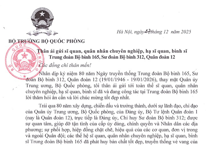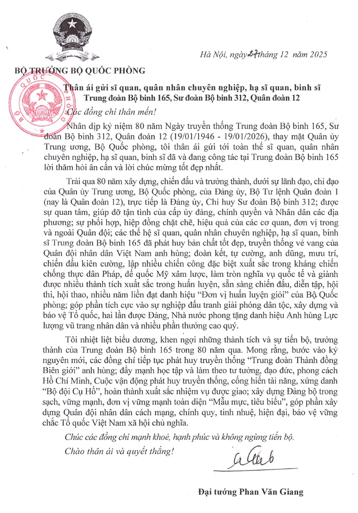 Nhân dịp kỷ niệm 80 năm Ngày truyền thống Trung đoàn Bộ binh 165, Sư đoàn Bộ binh 312, Quân đoàn 12 (19/01/1946 - 19/01/2026), thay mặt Quân ủy Trung ương, Bộ Quốc phòng, tôi thân ái gửi tới toàn thể sĩ quan, quân nhân chuyên nghiệp, hạ sĩ quan, binh sĩ đã và đang công tác tại Trung đoàn Bộ binh 165 lời thăm hỏi ân cần và lời chúc mừng tốt đẹp nhất.