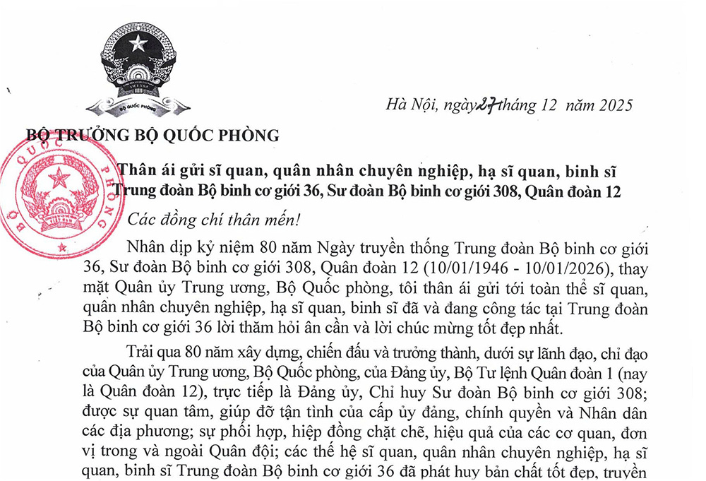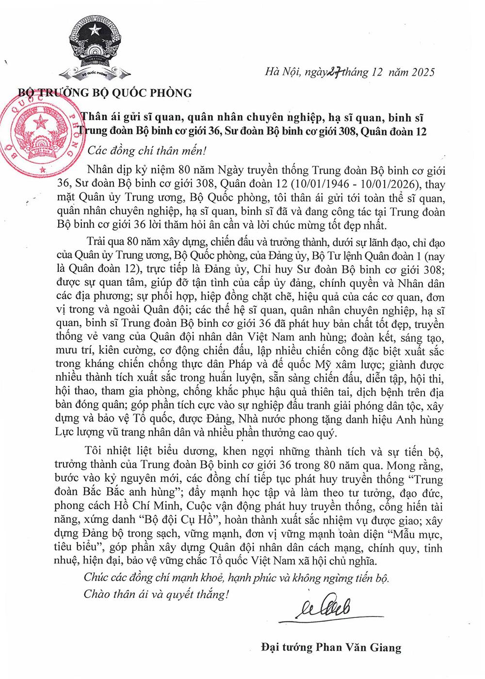 (Bqp.vn) - Nhân dịp kỷ niệm 80 năm Ngày truyền thống Trung đoàn Bộ binh cơ giới 36, Sư đoàn Bộ binh cơ giới 308, Quân đoàn 12 (10/01/1946 - 10/01/2026), Đại tướng Phan Văn Giang, Ủy viên Bộ Chính trị, Phó Bí thư Quân ủy Trung ương, Bộ trưởng Bộ Quốc phòng đã gửi thư chúc mừng tới toàn thể sĩ quan, quân nhân chuyên nghiệp, hạ sĩ quan, binh sĩ đã và đang công tác tại Trung đoàn Bộ binh cơ giới 36. Dưới đây là nội dung Thư của Đại tướng Phan Văn Giang:
