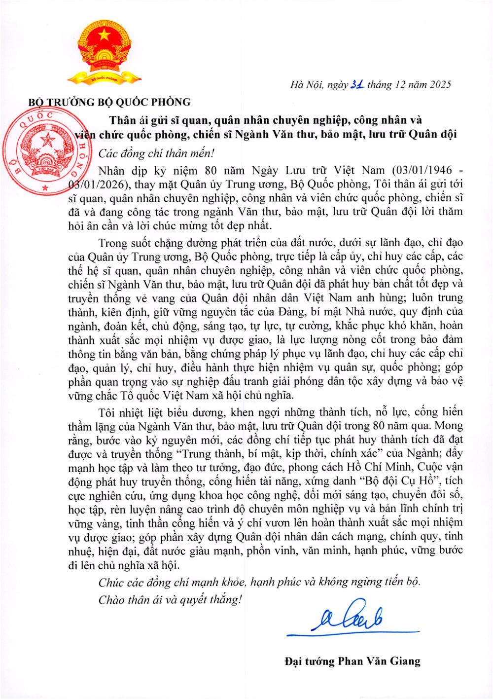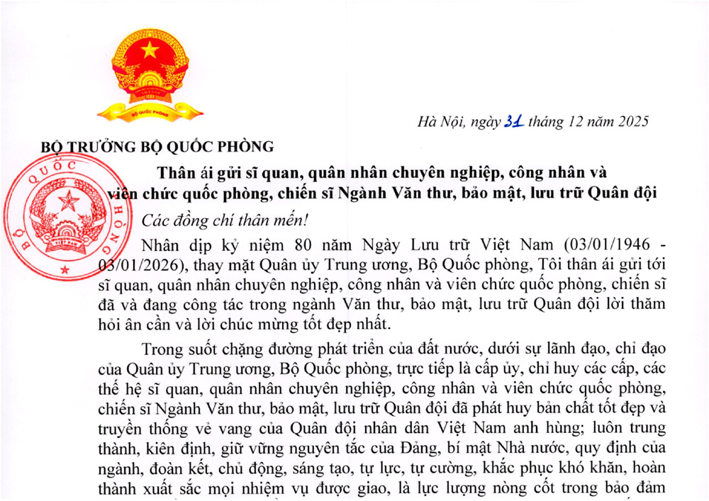 Nhân dịp kỷ niệm 80 năm Ngày Lưu trữ Việt Nam (03/01/1946 - 03/01/2026), thay mặt Quân ủy Trung ương, Bộ Quốc phòng, tôi thân ái gửi tới sĩ quan, quân nhân chuyên nghiệp, công nhân và viên chức quốc phòng, chiến sĩ đã và đang công tác trong ngành Văn thư, bảo mật, lưu trữ Quân đội lời thăm hỏi ân cần và lời chúc mừng tốt đẹp nhất.