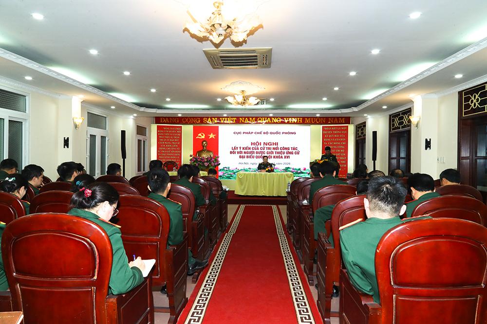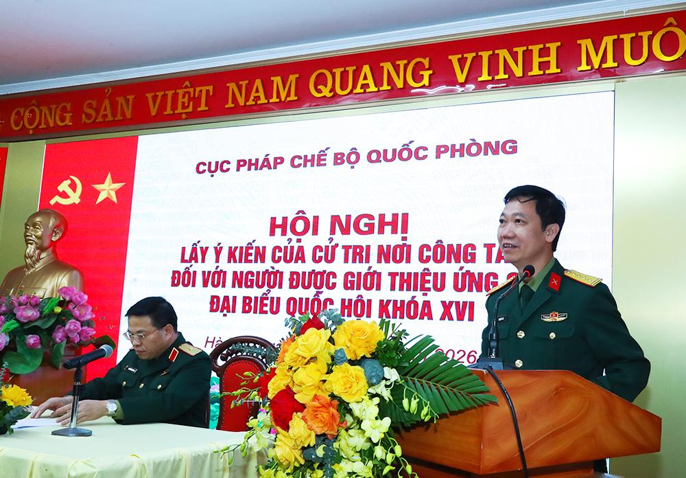 (Bqp.vn) - Chiều 13/1, tại Hà Nội, Cục Pháp chế Bộ Quốc phòng tổ chức Hội nghị lấy ý kiến cử tri nơi công tác đối với Đại tá Phạm Đức Hoài, Ủy viên Ban Thường vụ, Phó Cục trưởng Cục Pháp chế Bộ Quốc phòng - Người được giới thiệu ứng cử đại biểu Quốc hội Khóa XVI, nhiệm kỳ 2026 - 2031. Thiếu tướng Nguyễn Việt Dũng, Bí thư Đảng ủy, Cục trưởng Cục Pháp chế Bộ Quốc phòng.