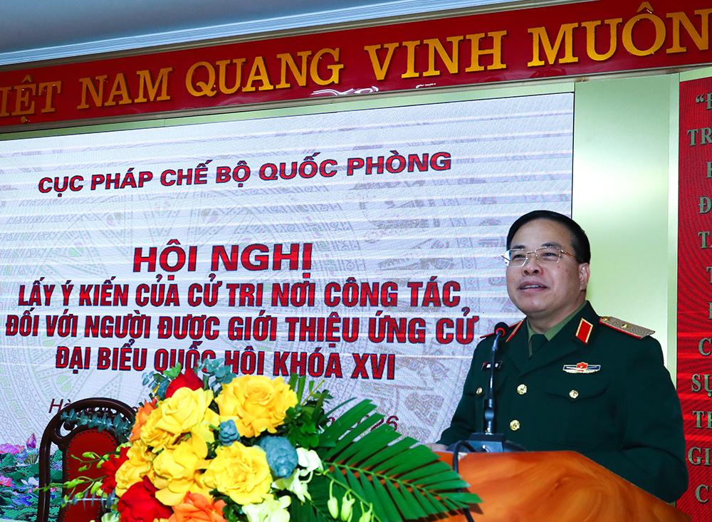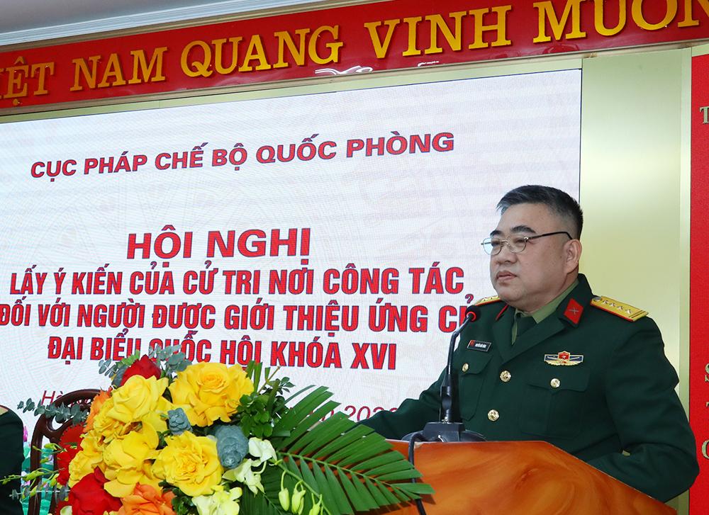 Dự hội nghị có các đồng chí trong Thường vụ Đảng ủy, lãnh đạo, chỉ huy Cục Pháp chế Bộ Quốc phòng; đại diện Cục Chính trị Bộ Tổng Tham mưu và đông đảo cử tri Cục Pháp chế Bộ Quốc phòng.