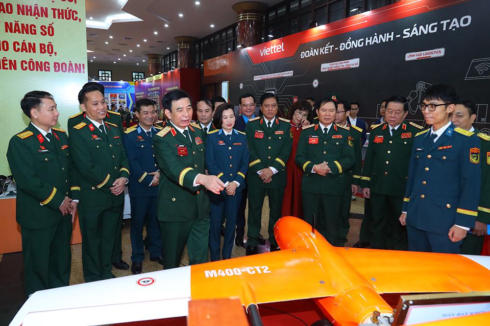 Đại tướng Phan Văn Giang và các đại biểu tham quan các sản phẩm khoa học, công nghệ của các cơ quan, đơn vị được trưng bày tại đại hội.