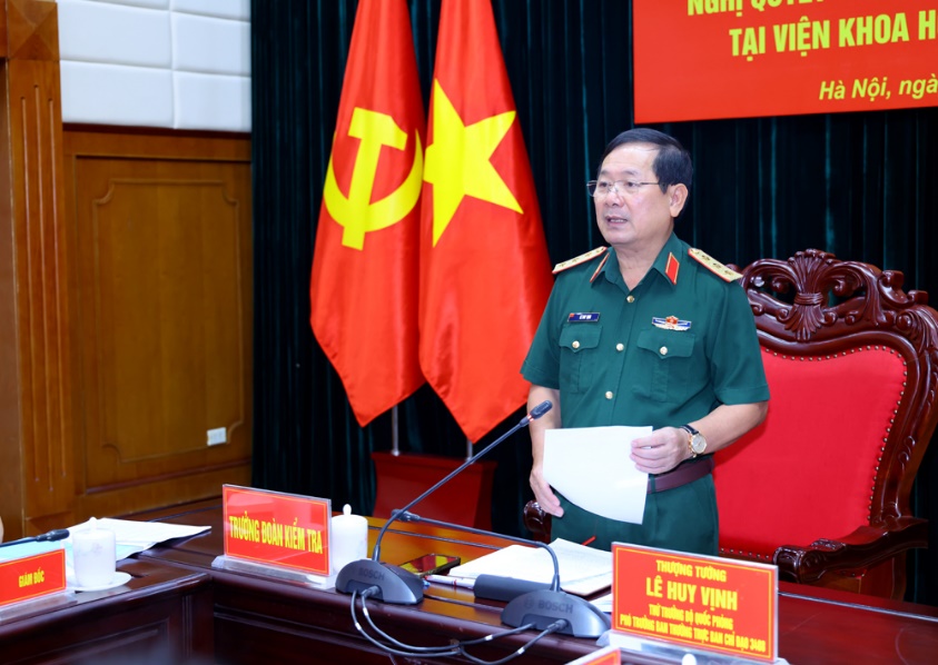 Phát biểu kết luận kiểm tra, Thượng tướng Lê Huy Vịnh ghi nhận, đánh giá cao sự chủ động, nỗ lực của Viện Khoa học và Công nghệ quân sự trong việc cụ thể hóa, triển khai thực hiện các nghị quyết của Bộ Chính trị và Quân ủy Trung ương; biểu dương những kết quả thiết thực mà Viện đạt được trong nghiên cứu, ứng dụng KHCN vào nhiệm vụ quân sự, quốc phòng. Thượng tướng Lê Huy Vịnh nhấn mạnh, KHCN đang trở thành một trong những yếu tố quyết định sức mạnh chiến đấu của quân đội hiện đại; vì vậy, việc thực hiện hiệu quả các nghị quyết có ý nghĩa đặc biệt quan trọng, vừa trực tiếp nâng cao chất lượng nghiên cứu, vừa góp phần xây dựng tiềm lực khoa học - công nghệ quốc phòng của đất nước.