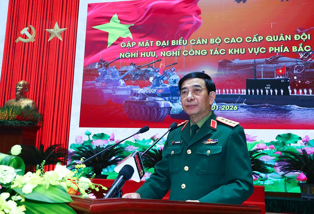 Phát biểu tại buổi gặp mặt, thay mặt Quân ủy Trung ương, Bộ Quốc phòng, Đại tướng Phan Văn Giang bày tỏ niềm phấn khởi, vui mừng được đón tiếp và gặp lại các đồng chí đại biểu cán bộ cao cấp Quân đội nghỉ hưu, nghỉ công tác qua các thời kỳ đúng vào dịp toàn Đảng, toàn dân, toàn quân đang thi đua lập thành tích cao nhất chào mừng Đại hội Đại biểu toàn quốc lần thứ XIV của Đảng; đón chào năm mới 2026 và chuẩn bị đón Tết cổ truyền Bính Ngọ. Thông báo khái quát tình hình thời sự thế giới, khu vực, trong nước; kết quả nổi bật về công tác quân sự, quốc phòng, xây dựng Đảng bộ Quân đội năm 2025; phương hướng nhiệm vụ trọng tâm năm 2026, Đại tướng Phan Văn Giang trân trọng đề nghị các đồng chí cán bộ cao cấp Quân đội đã nghỉ hưu, nghỉ công tác với bản lĩnh, trí tuệ, kinh nghiệm, trách nhiệm, sự tâm huyết của những người đã dành gần trọn cuộc đời mình đối với sự nghiệp xây dựng và bảo vệ Tổ quốc, xây dựng Quân đội, củng cố quốc phòng của đất nước, tiếp tục quan tâm, đóng góp ý kiến, chia sẻ kinh nghiệm quý báu.