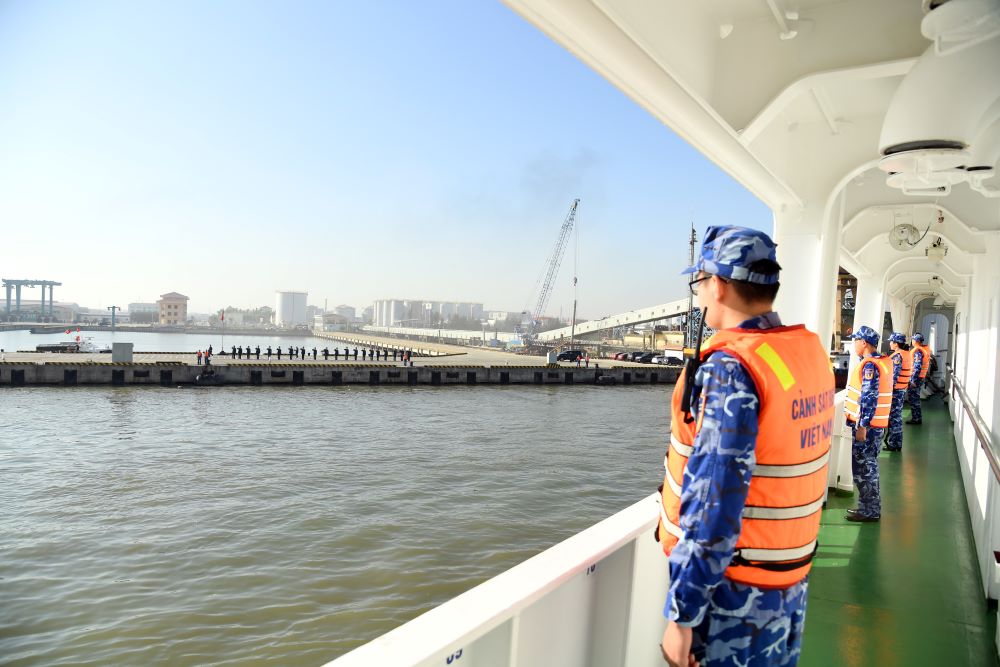 (Bqp.vn) - Sáng 29/11, tàu CSB 8004 cùng Đoàn công tác Cảnh sát biển Việt Nam đã cập cảng Hải đoàn 11 (Bộ Tư lệnh Vùng Cảnh sát biển 1) an toàn, kết thúc tốt đẹp chuyến thăm, làm việc tại Nhật Bản.