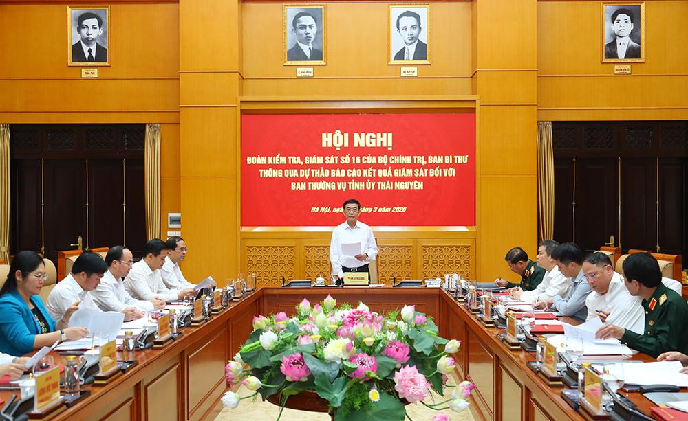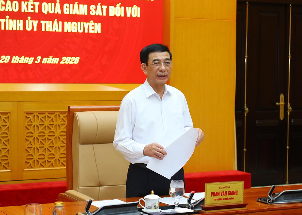 Phát biểu kết luận hội nghị, thay mặt Đoàn kiểm tra, giám sát, Đại tướng Phan Văn Giang đánh giá cao tinh thần làm việc nghiêm túc, thẳng thắn, cầu thị và trách nhiệm của Ban Thường vụ Tỉnh ủy Thái Nguyên trong lãnh đạo, chỉ đạo việc nghiên cứu, học tập, quán triệt, triển khai nghiêm túc Nghị quyết Đại hội XIV của Đảng; kịp thời ban hành chương trình hành động và chỉ đạo các cấp ủy, tổ chức đảng trực thuộc xây dựng kế hoạch thực hiện gắn với điều kiện thực tiễn của địa phương, đơn vị. Ban Thường vụ Tỉnh ủy Thái Nguyên đã lãnh đạo, chỉ đạo kịp thời ban hành các văn bản cần thiết; thành lập Ban Chỉ đạo bầu cử; chỉ đạo thành lập đầy đủ các tổ chức phụ trách bầu cử; chuẩn bị cơ sở vật chất, kinh phí, nhân sự và các điều kiện cần thiết để bảo đảm cuộc bầu cử được tổ chức dân chủ, đúng pháp luật, an toàn và tiết kiệm. Công tác tuyên truyền về bầu cử đại biểu Quốc hội khóa XVI và HĐND các cấp nhiệm kỳ 2026 - 2031 được triển khai tốt; tỷ lệ cử tri tham gia bầu cử đạt 99,82%, là một trong 10 địa phương có tỷ lệ cao nhất cả nước.