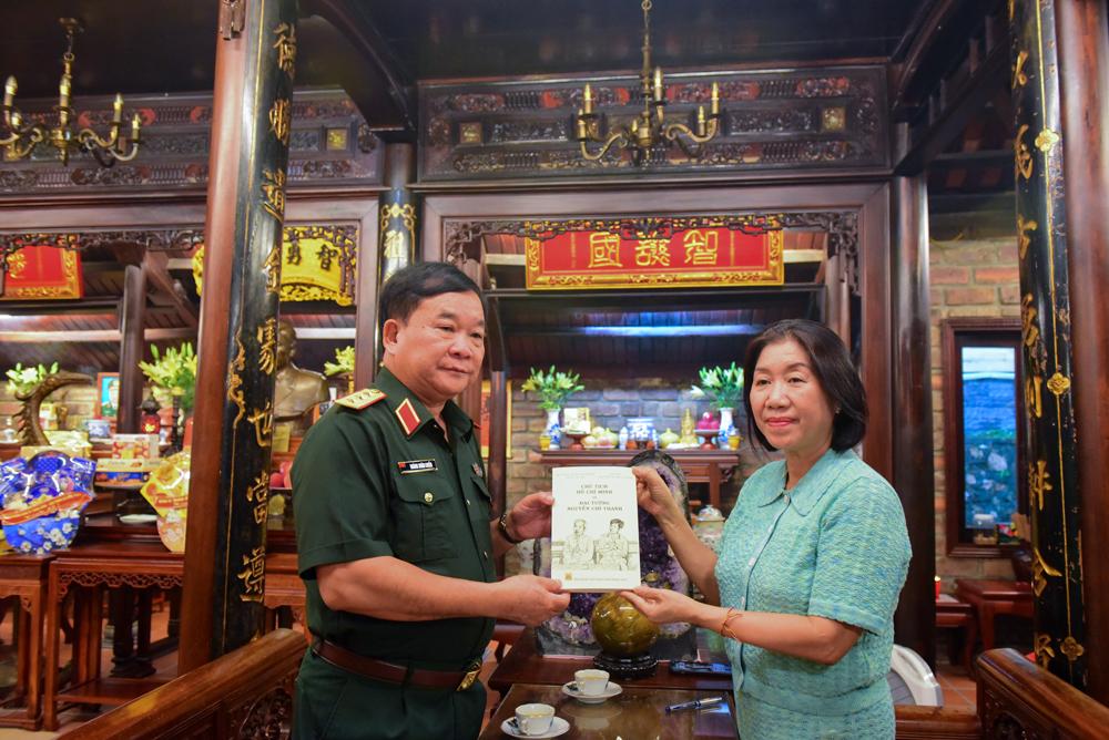Bà Đặng Thị Minh Ngọc trao tặng Thượng tướng Hoàng Xuân Chiến cuốn sách “Chủ tịch Hồ Chí Minh và Đại tướng Nguyễn Chí Thanh”.