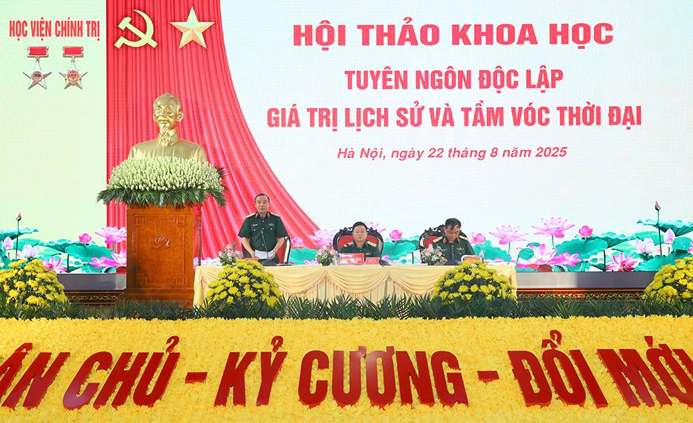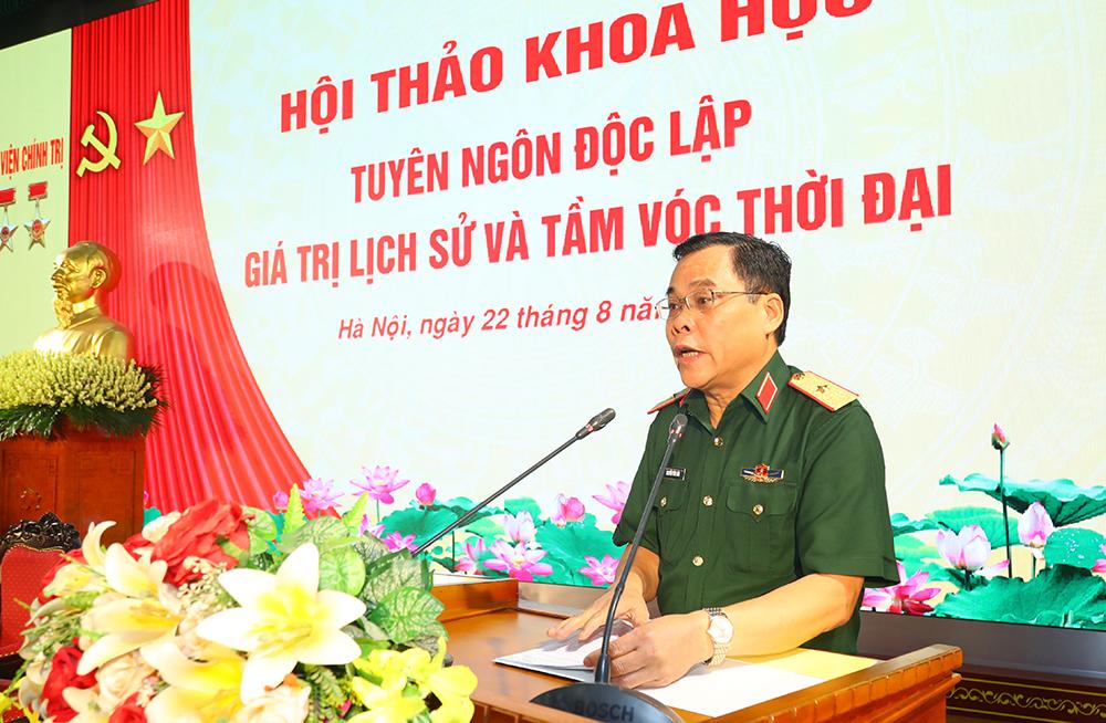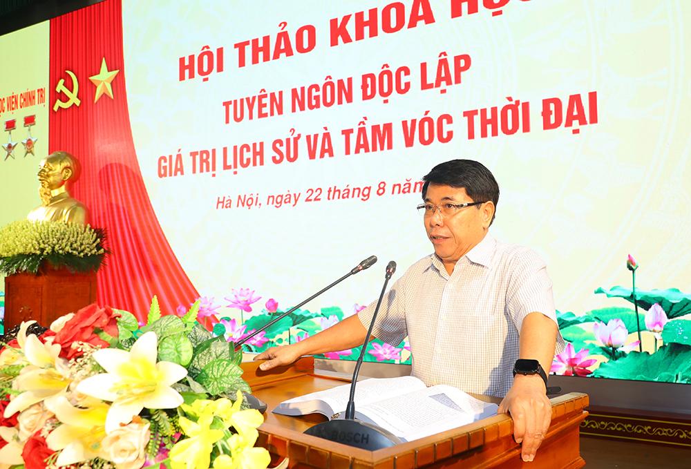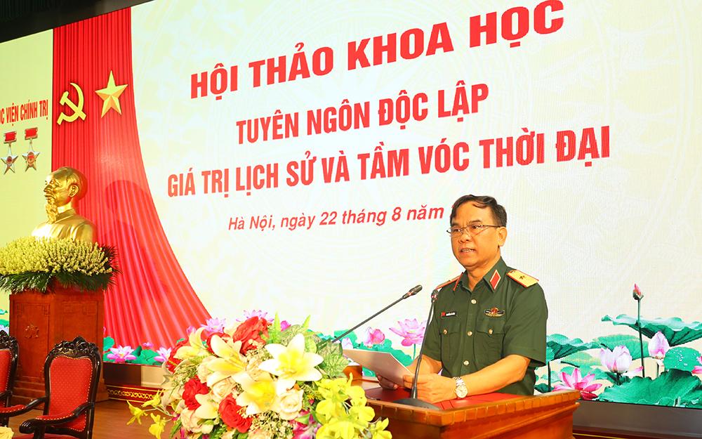 Trình bày báo cáo đề dẫn hội thảo, Thiếu tướng, PGS, TS Nguyễn Bá Hùng, Chính ủy Học viện Chính trị khẳng định, Tuyên ngôn Độc lập là một văn kiện lịch sử, một văn bản pháp lý quan trọng bậc nhất của nước ta. Văn kiện pháp lý này thay thế cho tất cả các văn kiện pháp lý của các chế độ cũ trước đó, bằng những lý lẽ đanh thép đã làm rõ những cơ sở pháp lý của nền độc lập của dân tộc, chủ quyền và toàn vẹn lãnh thổ của dân tộc Việt Nam. Khẳng định ý chí sắt đá không gì lay chuyển nổi, đồng thời là triết lý nhân sinh vĩnh hằng của dân tộc Việt Nam được Chủ tịch Hồ Chí Minh phát hiện, khẳng định: “Không có gì quý hơn độc lập, tự do”. Bản Tuyên ngôn thể hiện tinh thần và ý chí của một dân tộc dù bị áp bức, bóc lột đến cùng cực, đã gan góc, kiên cường đấu tranh để quyết giành bằng được quyền sống, quyền tự do và quyền mưu cầu hạnh phúc cho mình. Trong những lời văn bất hủ đã đi vào lịch sử dân tộc đó, Bản Tuyên ngôn đã thể hiện quyết tâm sắt đá của toàn thể dân tộc Việt Nam quyết bảo vệ thành quả cách mạng là “nền tự do và độc lập”.