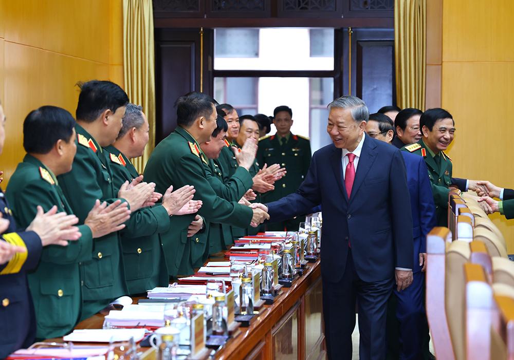 Tổng Bí thư Tô Lâm, Bí thư Quân ủy Trung ương với các đại biểu tham dự hội nghị.