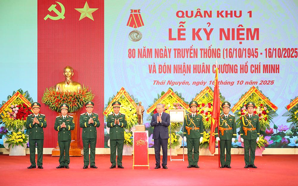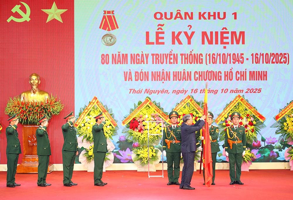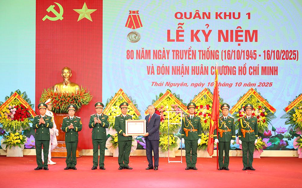 (Bqp.vn) - Chiều 16/10, Quân khu 1 trọng thể tổ chức Lễ kỷ niệm 80 năm Ngày truyền thống (16/10/1945 - 16/10/2025) và đón nhận Huân chương Hồ Chí Minh. Tổng Bí thư Tô Lâm, Bí thư Quân ủy Trung ương dự và phát biểu chỉ đạo tại buổi lễ.