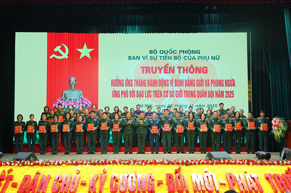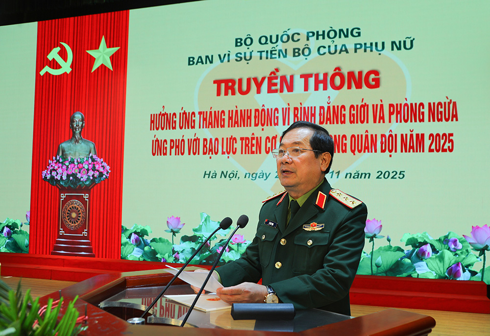 (Bqp.vn) - Sáng 26/11, tại Hà Nội, Ban Vì sự tiến bộ của phụ nữ (VSTBCPN) Bộ Quốc phòng tổ chức truyền thông hưởng ứng Tháng hành động vì bình đẳng giới và phòng ngừa, ứng phó với bạo lực trên cơ sở giới trong Quân đội năm 2025 với chủ đề “Bình đẳng giới và an toàn cho phụ nữ và trẻ em gái trong kỷ nguyên số”. Thượng tướng Lê Huy Vịnh, Ủy viên Trung ương Đảng, Thứ trưởng Bộ Quốc phòng, Trưởng Ban VSTBCPN Bộ Quốc phòng dự và phát biểu chỉ đạo.
