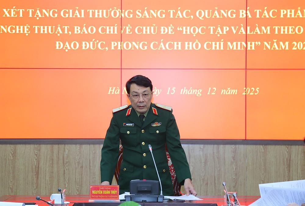 (Bqp.vn) - Sáng 15/12, tại Hà Nội, Tổng cục Chính trị QĐND Việt Nam tổ chức họp Hội đồng chung khảo xét tặng Giải thưởng sáng tác, quảng bá tác phẩm văn học nghệ thuật, báo chí về chủ đề “Học tập và làm theo tư tưởng, đạo đức, phong cách Hồ Chí Minh” năm 2025. Thiếu tướng Nguyễn Xuân Thủy, Phó Cục trưởng Cục Tuyên huấn, Chủ tịch Hội đồng chung khảo chủ trì cuộc họp.