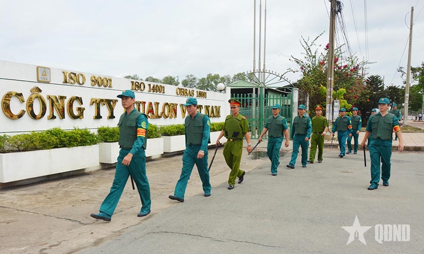 | Dân quân, công an và tự vệ doanh nghiệp ở Đồng Nai tuần tra bảo vệ hoạt động sản xuất kinh doanh. |