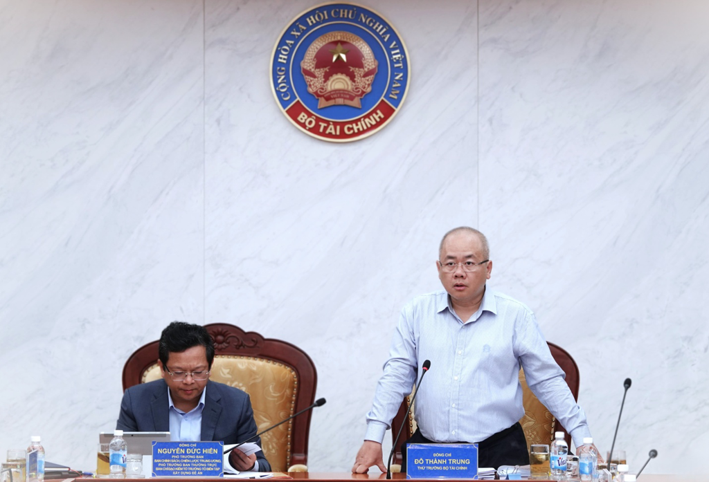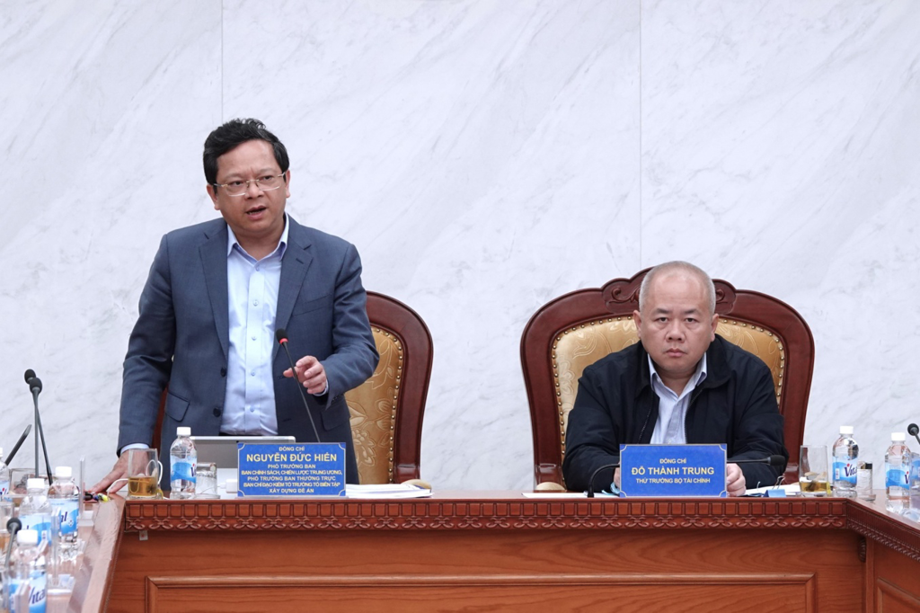 Thứ trưởng Bộ Tài chính Đỗ Thành Trung và ông Nguyễn Đức Hiển, Phó Trưởng Ban Chính sách, chiến lược Trung ương, Phó Trưởng ban Thường trực Ban Chỉ đạo đồng chủ trì buổi làm việc. Cùng tham dự buổi làm việc có đại diện các đơn vị chuyên môn Ban Chính sách, chiến lược Trung ương; đại diện các Bộ, ngành và các đơn vị thuộc Bộ Tài chính.