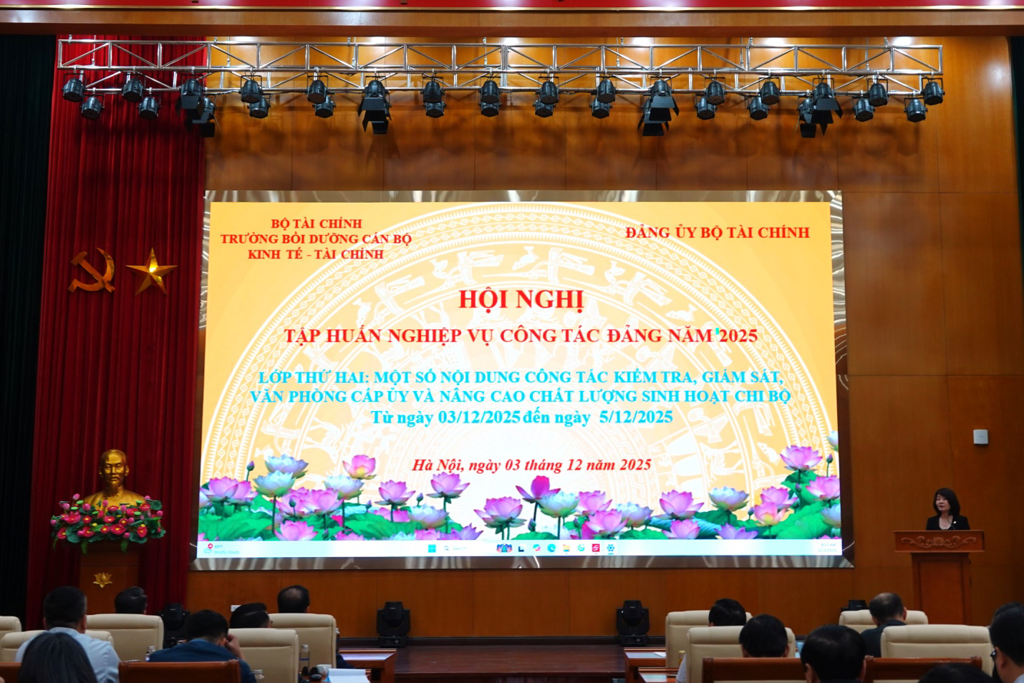 Sáng ngày 03/12, Bộ Tài chính tiếp tục tổ chức Lớp tập huấn một số nội dung công tác kiểm tra, giám sát, văn phòng cấp ủy và nâng cao chất lượng sinh hoạt chi bộ. Đây là lớp thứ hai trong Chương trình tập huấn nghiệp vụ công tác Đảng năm 2025. Đồng chí Nguyễn Thị Thu Lan, Phó Bí thư chuyên trách Đảng ủy Bộ Tài chính tham dự và chỉ đạo Hội nghị.