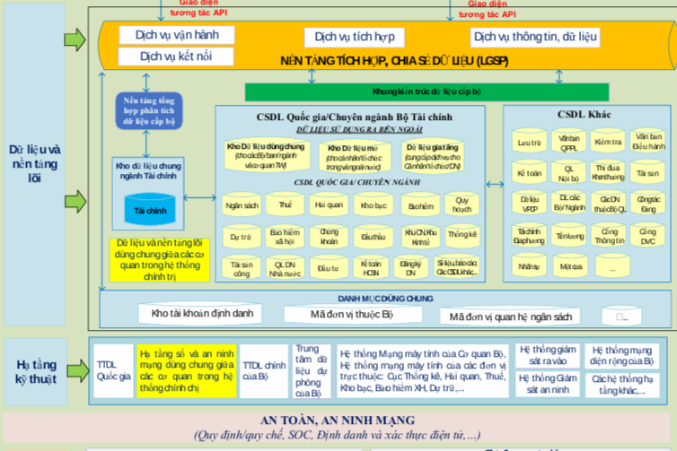 Khung kiến trúc số gồm 4 lớp thành phần chính. Lớp thứ nhất là hạ tầng số và an ninh mạng dùng chung, bao gồm Trung tâm dữ liệu Bộ Tài chính, nền tảng điện toán đám mây, mạng thông tin diện rộng và mạng truyền số liệu chuyên dùng (TSLCD). Hệ thống hạ tầng này cung cấp năng lực tính toán, lưu trữ và bảo mật cấp cao, bảo đảm kết nối xuyên suốt từ trung ương tới địa phương, kể cả tại vùng sâu, vùng xa thông qua các công nghệ truyền dẫn linh hoạt.