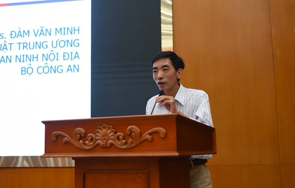 Thượng tá Đàm Văn Minh – Trinh sát viên cao cấp, báo cáo viên pháp luật trung ương, Cục An ninh nội địa (A02), Bộ Công an trình bày nội dung cơ bản lĩnh vực phòng, chống khủng bố. Ảnh: Tuệ Anh