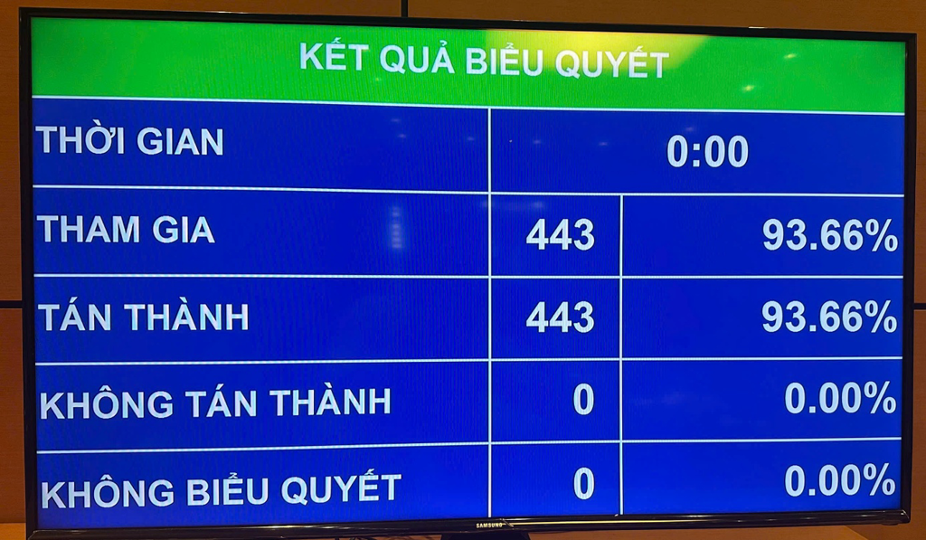 Với 443/443 đại biểu Quốc hội có mặt biểu quyết tán thành, Quốc hội đã chính thức thông qua Nghị quyết về điều chỉnh Quy hoạch tổng thể quốc gia thời kỳ 2021 - 2030, tầm nhìn đến năm 2050.