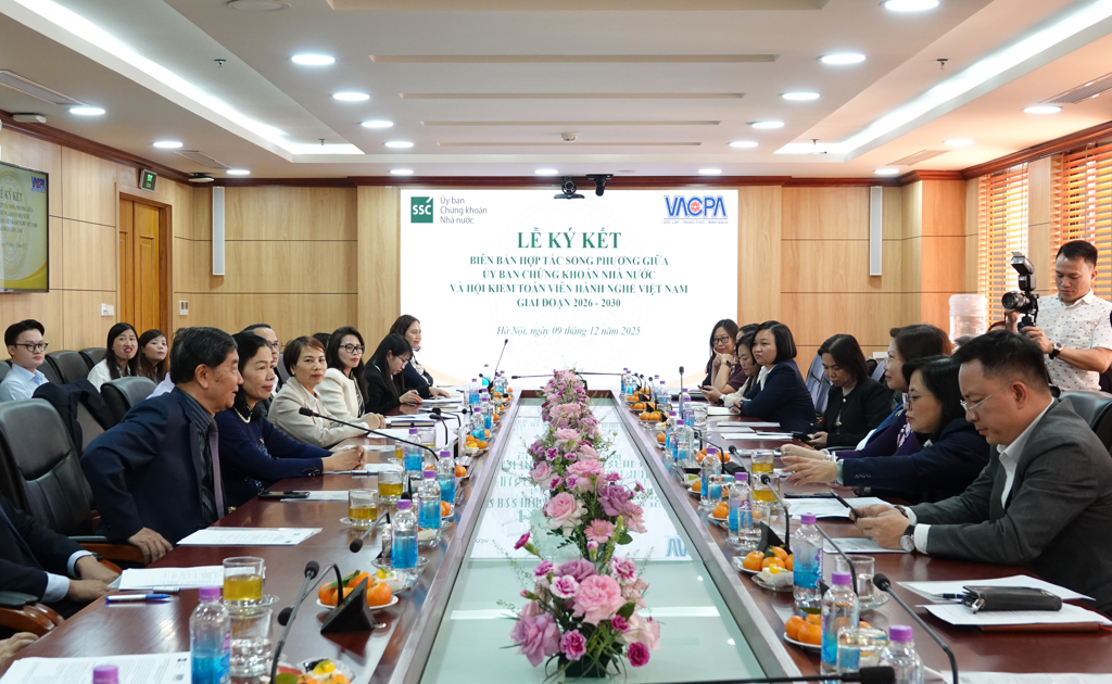 Chiều 9/12, tại trụ sở Ủy ban Chứng khoán Nhà nước (UBCKNN) đã diễn ra lễ ký kết Biên bản hợp tác giai đoạn 2025–2030 giữa UBCKNN và Hội Kiểm toán viên hành nghề Việt Nam (VACPA). Sự kiện đánh dấu bước phát triển mới trong 15 năm hợp tác giữa hai cơ quan, đặc biệt trong công tác kiểm soát chất lượng kiểm toán và nâng cao minh bạch thị trường chứng khoán.