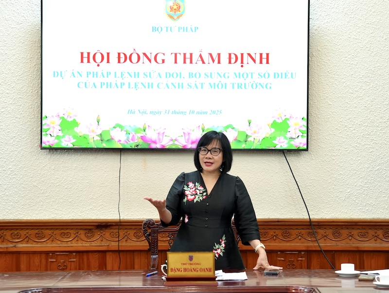 Sáng 31/10, Thứ trưởng Bộ Tư pháp Đặng Hoàng Oanh đã chủ trì hội đồng thẩm định dự án Pháp lệnh sửa đổi, bổ sung một số điều của Pháp lệnh Cảnh sát môi trường (dự án).