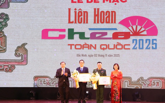 Thứ trưởng Bộ Văn hóa, Thể thao và Du lịch Tạ Quang Đông và Phó Chủ tịch Thường trực HĐND tỉnh Bắc Ninh Trần Thị Hằng trao Huy chương Vàng cho hai vở diễn: "Nguyễn Văn Cừ – Tuổi trẻ chí lớn" của Nhà hát Chèo Quân đội và "Thiên mệnh" của Nhà hát Chèo Bắc Ninh.