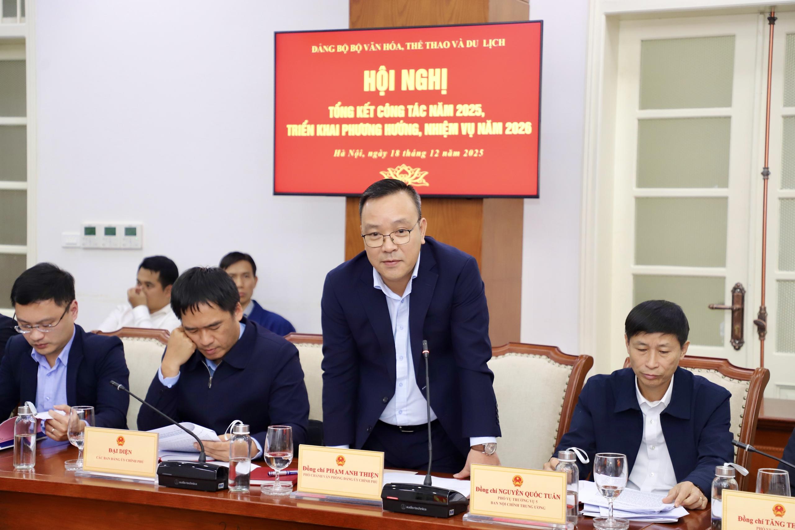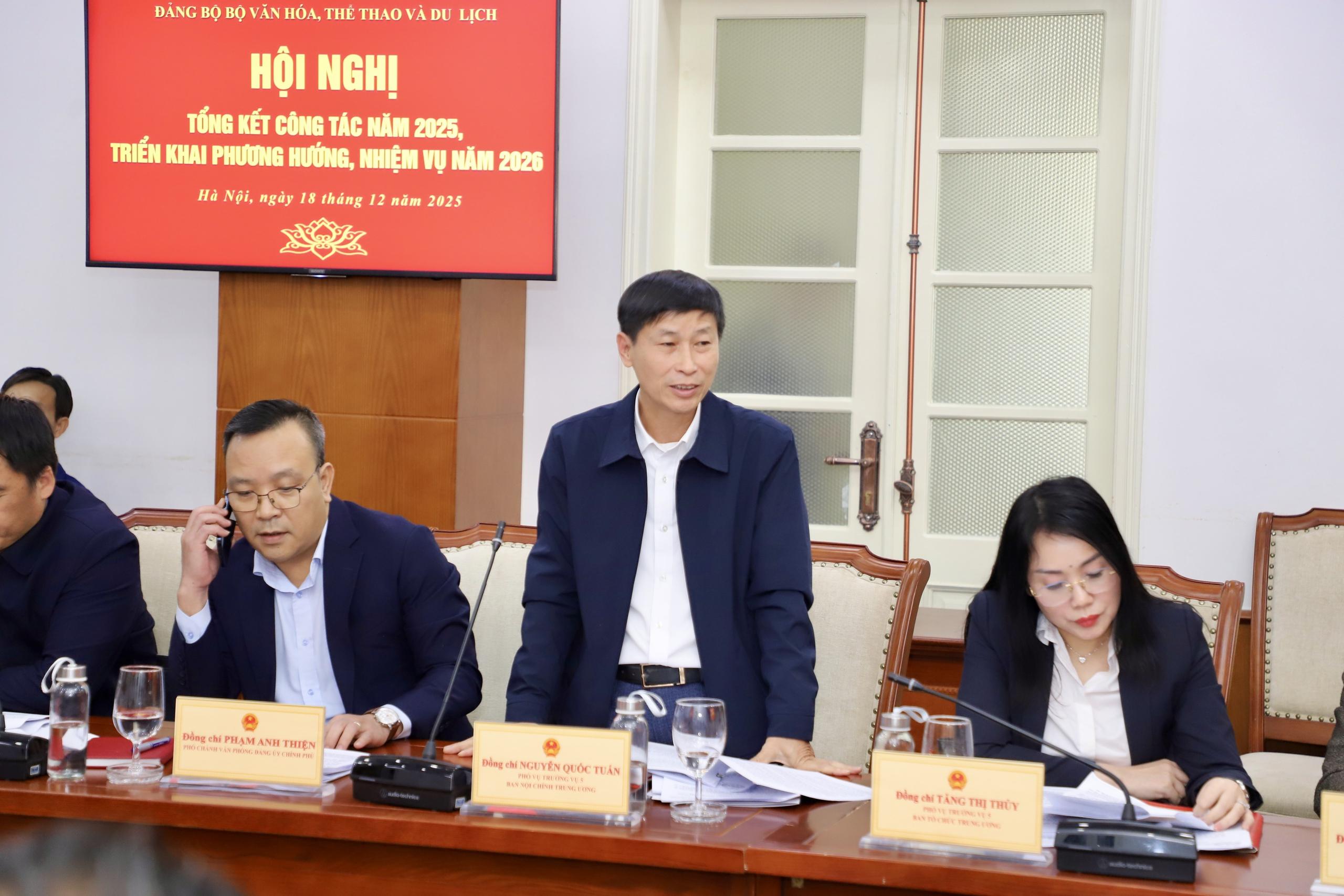 Tại Hội nghị, Ủy viên dự khuyết Ban Chấp hành Trung ương Đảng, Phó Bí thư Thường trực Đảng ủy, Thứ trưởng Thường trực Bộ VHTTDL Lê Hải Bình đã trình bày tóm tắt dự thảo báo cáo Tổng kết công tác năm 2025, triển khai phương hướng, nhiệm vụ năm 2026 của đảng ủy Bộ VHTTDL.