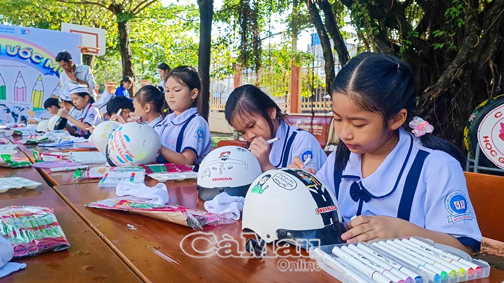 Phần thi vẽ mũ bảo hiểm là một trong nhiều nội dung được tổ chức tại chương trình Trao tặng mũ bảo hiểm cho học sinh lớp 1, năm học 2025-2026 tại Trường Tiểu học Hùng Vương. Với thông điệp “Ðội mũ xinh bảo vệ chúng mình”, hoạt động giúp trẻ dần hình thành ý thức tham gia giao thông an toàn từ nhỏ.