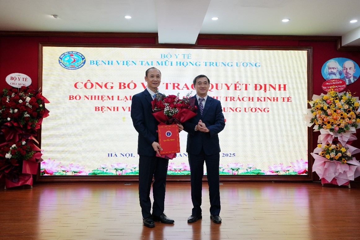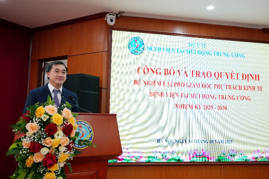 Tại buổi lễ, thừa ủy quyền của Bộ trưởng Bộ Y tế, đồng chí Trần Văn Khanh, Phó Vụ trưởng Vụ Tổ chức Cán bộ Bộ Y tế đã công bố Quyết định số 3268/QĐ-BYT ngày 16/10/2025 của Bộ trưởng Bộ Y tế về việc bổ nhiệm lại chức vụ Phó Giám đốc phụ trách kinh tế Bệnh viện Tai Mũi Họng Trung ương đối với ThS.KS Đỗ Việt Thắng. Thời hạn giữ chức vụ 05 năm, kể từ ngày quyết định có hiệu lực.