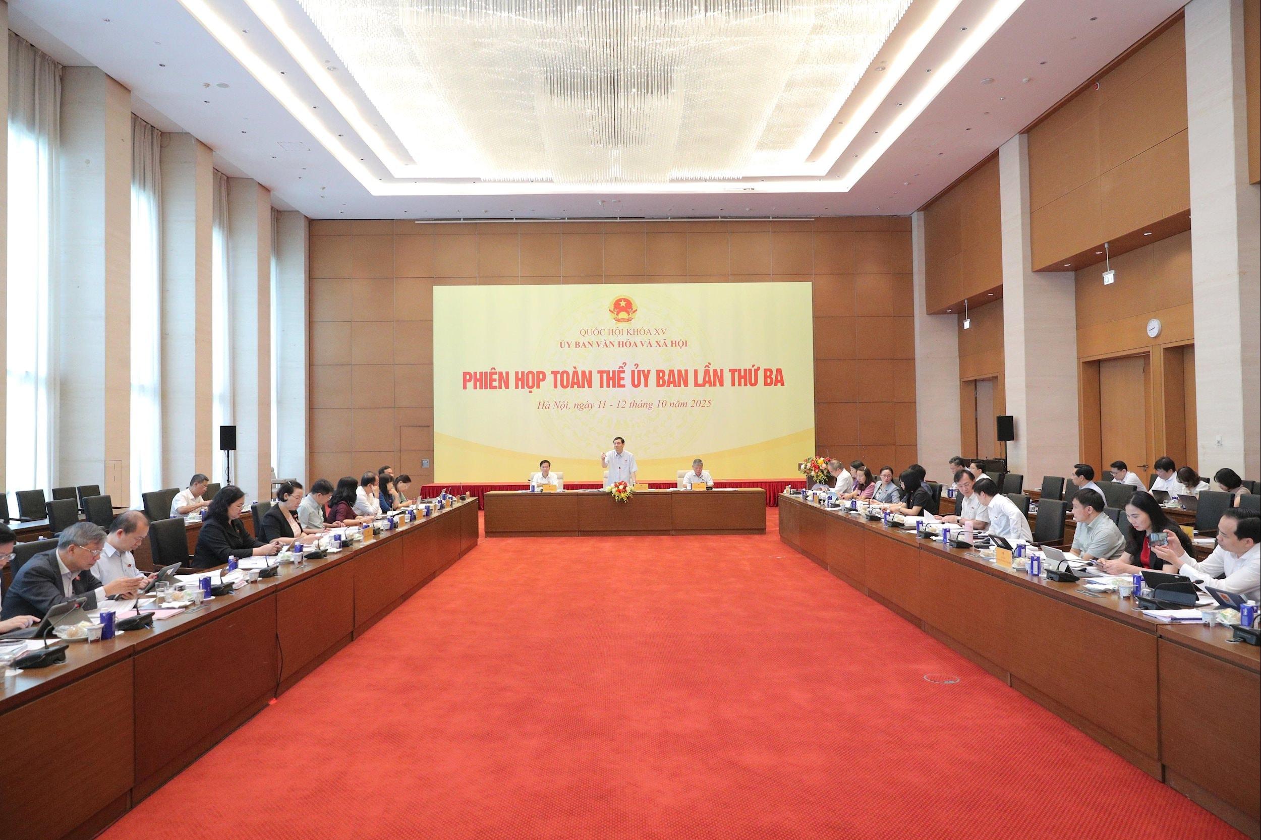 Sáng 12/10/2025, tại Nhà Quốc hội, tiếp tục Phiên họp toàn thể lần thứ 3, Ủy ban Văn hóa và Xã hội tiến hành thẩm tra 2 dự án Luật và cho ý kiến đối với 2 dự thảo nghị quyết. Ủy viên Trung ương Đảng, Chủ nhiệm Ủy ban Văn hóa và Xã hội Nguyễn Đắc Vinh chủ trì phiên họp.