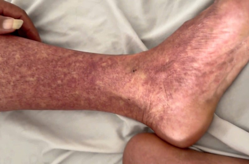Tại Khoa Cấp cứu, bệnh nhân ở ngày thứ 5 của bệnh, da nổi vân tím vùng bụng, chân và tay, có xuất huyết rải rác vùng cẳng chân, có dấu hiệu nhiễm trùng, thở nhanh phải hỗ trợ thở ô-xy.