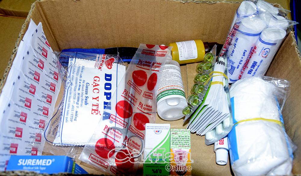Mỗi bộ dụng cụ bao gồm: thuốc hạ sốt, thuốc ho, thuốc tiêu hóa, thuốc nhỏ mắt, dầu gió, cùng các vật dụng sơ cứu như băng gạc, cồn, gòn, kéo y tế… Tất cả đều được đóng gói cẩn thận, kèm hướng dẫn sử dụng chi tiết, giúp người dân có thể tự chăm sóc sức khỏe cơ bản tại nhà.