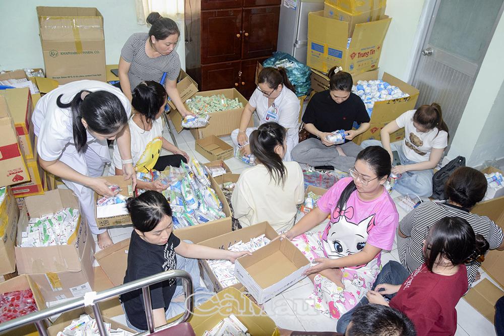 Không khí làm việc tại điểm tập kết hàng diễn ra khẩn trương nhưng ấm áp. Những người phụ nữ bình dị của Cà Mau cẩn thận phân loại từng loại thuốc, dán nhãn, chèn giấy hướng dẫn, rồi xếp gọn vào thùng để kịp chuyển lên xe cứu trợ.