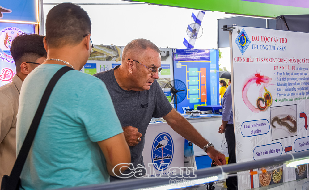 Du khách nước ngoài tò mò, hứng thú với các quy trình nuôi thuỷ sản công nghệ cao được trưng bày, giới thiệu tại ngày hội.
