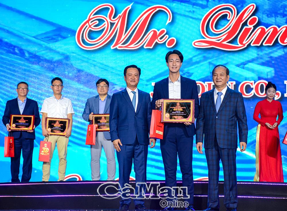 Phó Chủ tịch UBND tỉnh Cà Mau Lê Văn Sử trao bằng khen của Chủ tịch UBND tỉnh cho Công ty TNHH Phú Cường - Kiên Cường và cá nhân ông Lê Triệu Vĩnh, Giám đốc công ty (bìa trái), ghi nhận những đóng góp của đơn vị cho địa phương trong thời gian qua.